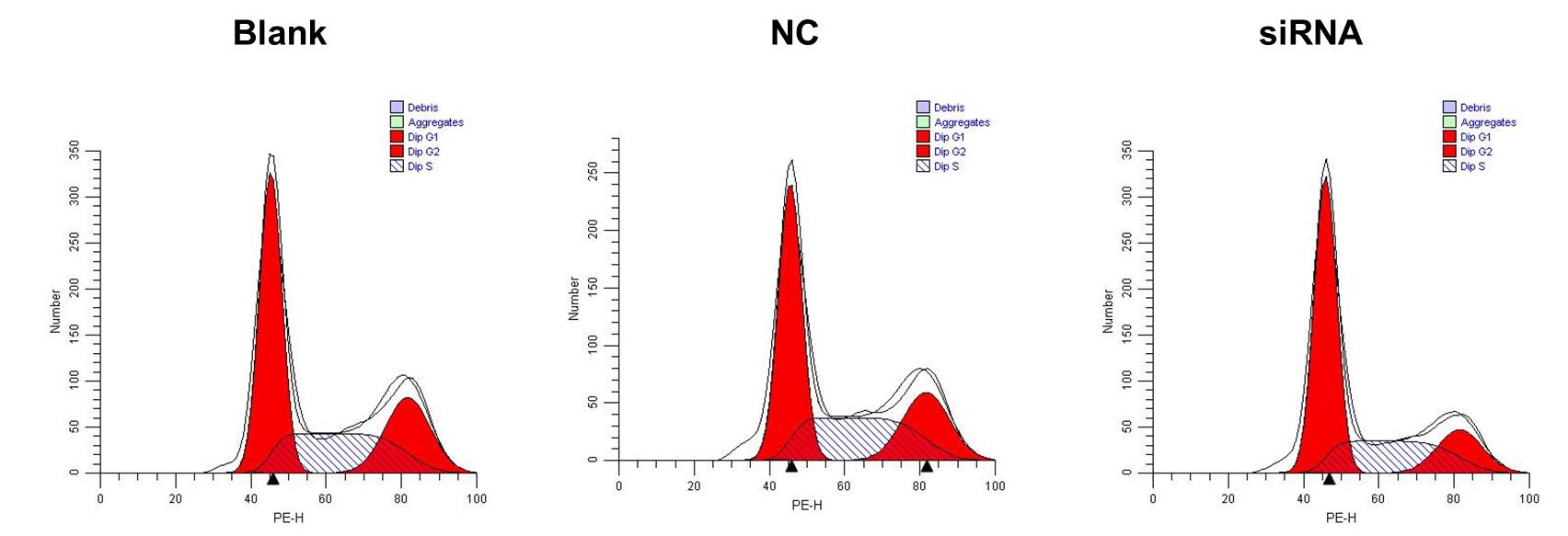 碘化丙啶(Propidium, PI)为插入性核酸荧光染料,能选择性的嵌入核酸DNA或RNA双链螺旋的碱基之间,产生红色荧光,并且荧光强度和所嵌入的核酸含量成正比。细胞周期检测时,首先用RNA 酶将RNA消化排除影响,通过流式细胞术检测PI荧光强度直接反映细胞各时相的DNA分布状态,从而计算出各时相的百分率。